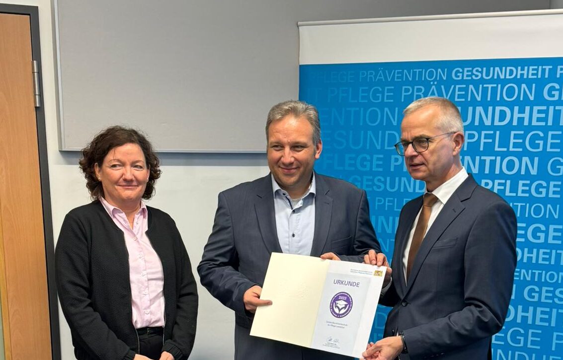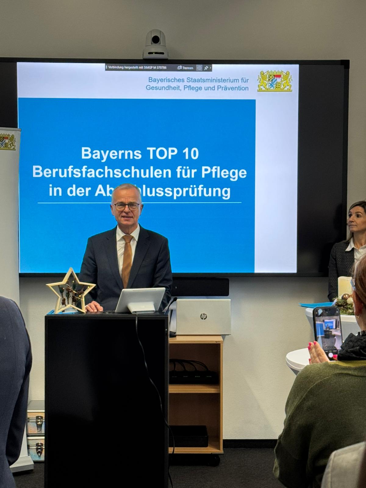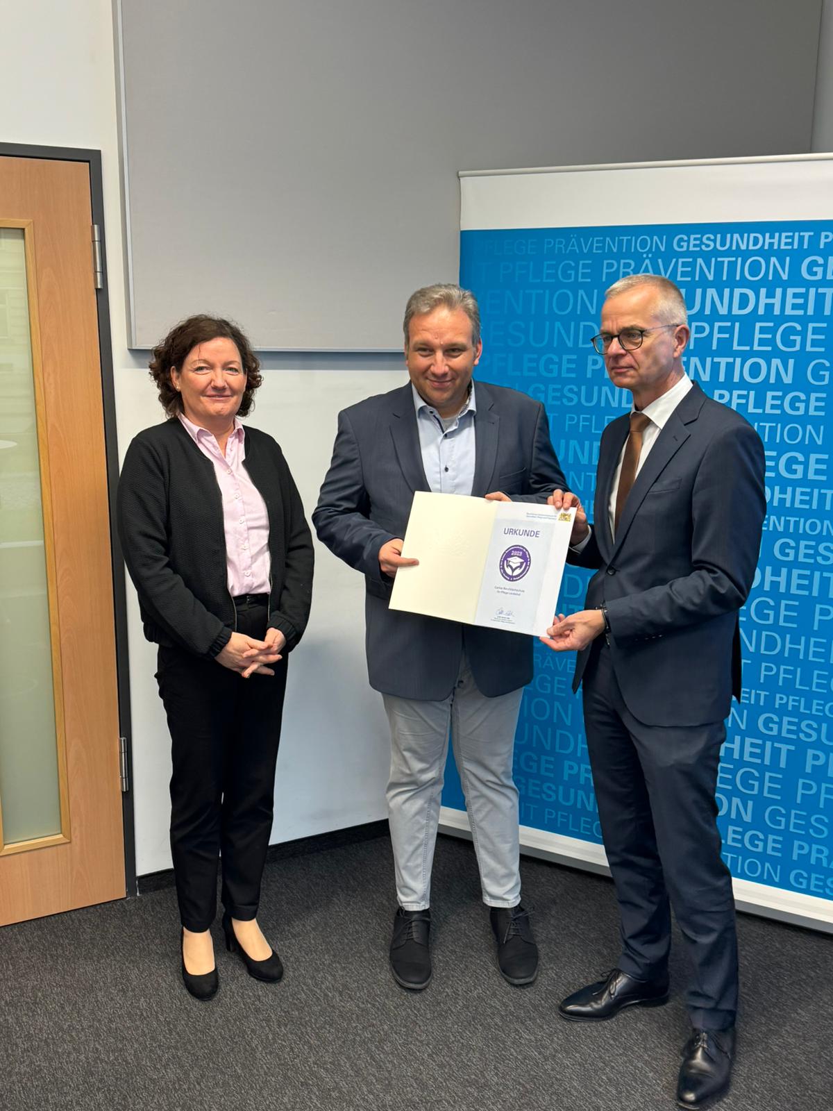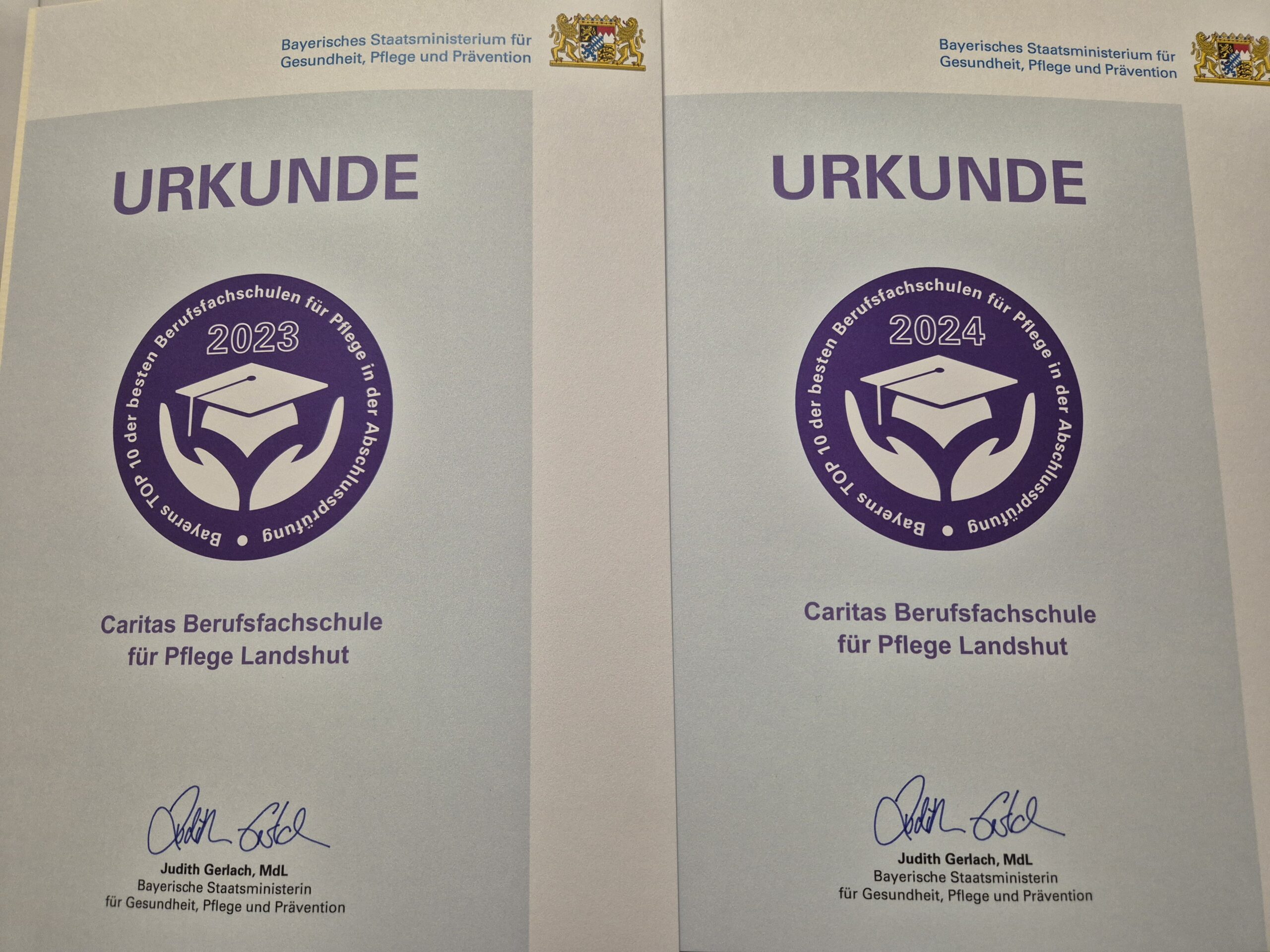 In einer feierlichen Stunde wurden im Staatsministerium für Pflege, Gesundheit und Prävention am 10.12.24 Bayerns TOP 10 der besten Berufsfachschulen für Pflege in der Abschlussprüfung geehrt. Bei derzeit ca. 200 Pflegeschulen in Bayern, konnte sich die Caritas Pflegeschule in Landshut über eine zweimalige Auszeichnung für das Jahr 2023 sowie das Jahr 2024 freuen. Die Urkunden wurden durch den Amtschef des Staatsministerium Herrn Dr. Rainer Hutka verliehen. Zudem wurden auch die besten Glückwünsche der Gesundheitsministerin Frau Judith Gerlach übermittelt.